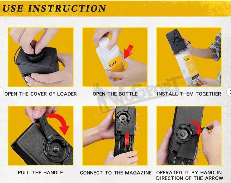 Lever Bottle Speed Loader de la WoSport este o piesă esențială a echipamentului pentru fiecare jucător de airsoft. Rotirea rapidă a manivelei vă permite să încărcați rapid aproape orice magazie M4/16 cu capac mediu.