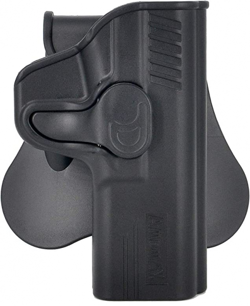 - Are un buton lock, care poate fi ușor apăsat cu degetul index pentru scoaterea rapidă a pistolului