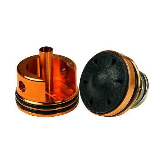 - Capul pistonului este ventilat, asigurându-se că garniturile de cauciuc sunt presate pe părțile laterale ale cilindrului atunci când aerul este comprimat