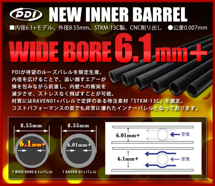 PDI 6.10mm High Precision Wide Bore Inner Barrel for AEG with a margin of 0.007mm per barrel. Wide bore barrels are known for pushing distance rather than power. Perfect for reaching targets without worrying about them reaching you. Material : carbon steel STKM-12C-EC