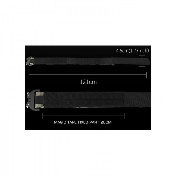 The belt is equipped with a metal quick release and with an attached "D-ring".